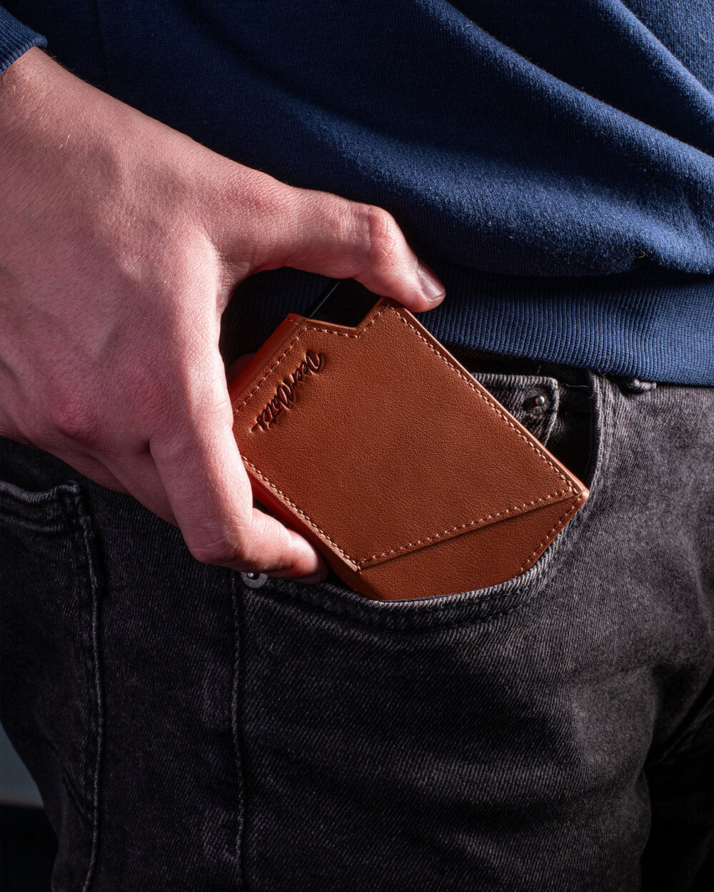Tieni i tuoi oggetti di valore al sicuro nelle nostre tasche in pelle con cuciture rinforzate. La tasca anteriore contiene carte e contanti, mentre la tasca posteriore ha spazio per chiavi e altro.