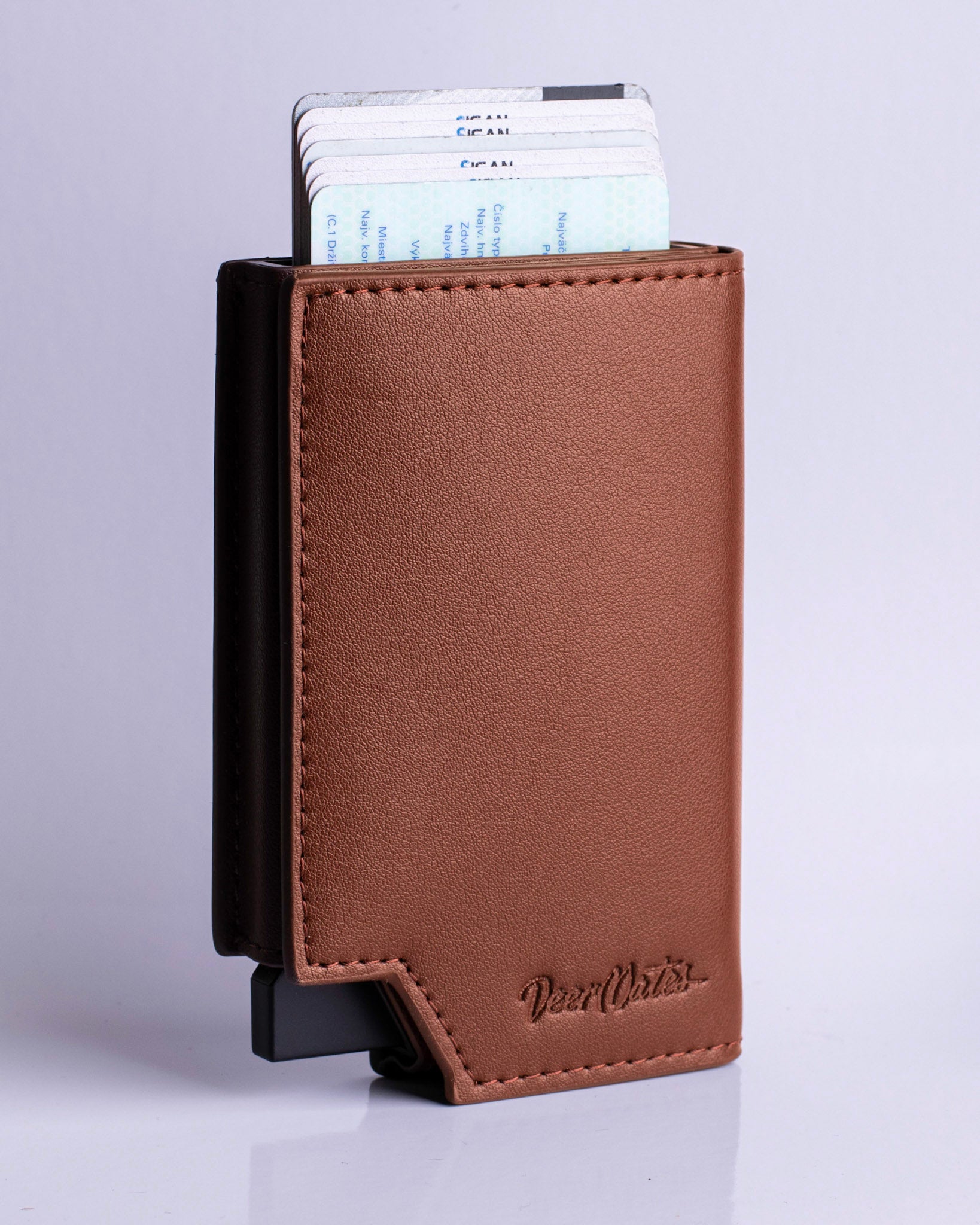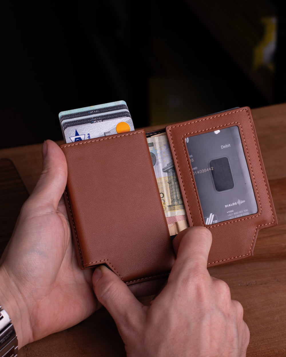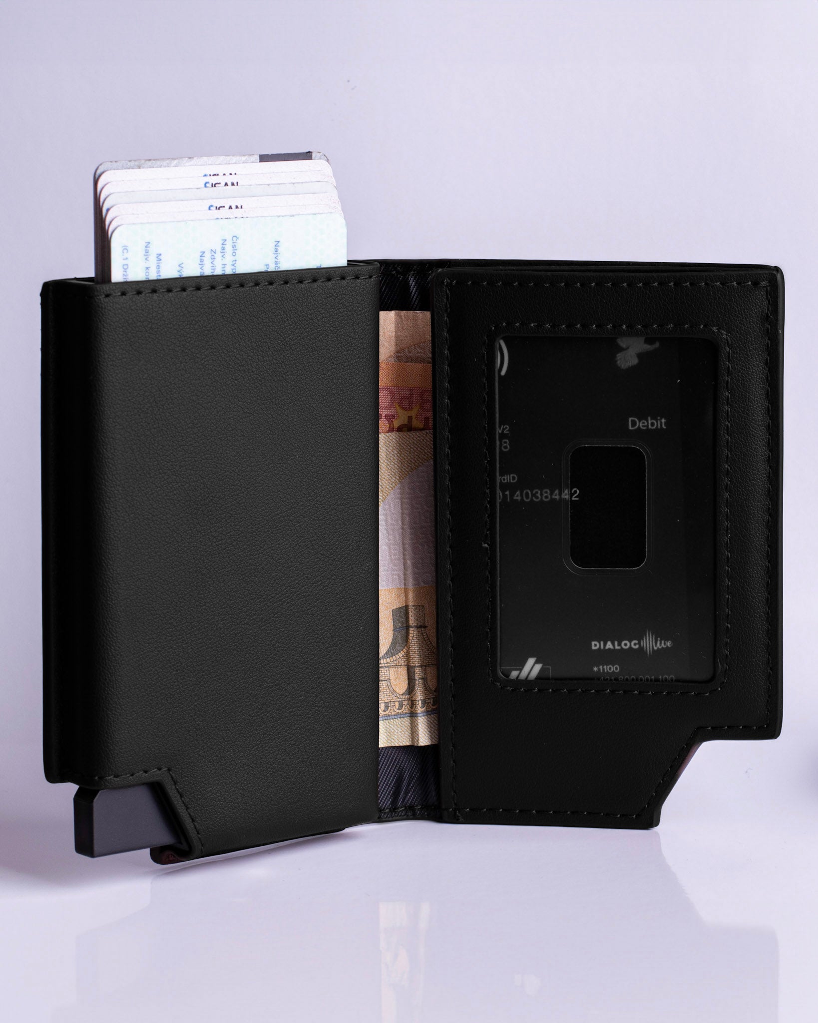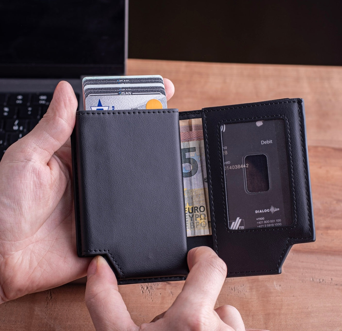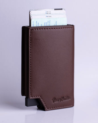 Realizzato in pelle vegana di alta qualità, combina ampia capacità, un fluido sistema pop-up per le carte ed eleganza minimalista in un design raffinato.